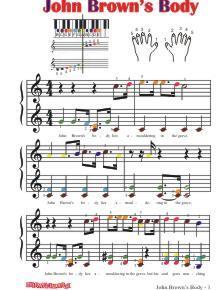 Sheet music for Kids with colored notes, images, scheme, lyrics, fingering.Three pages, PDF and Mp3 file.